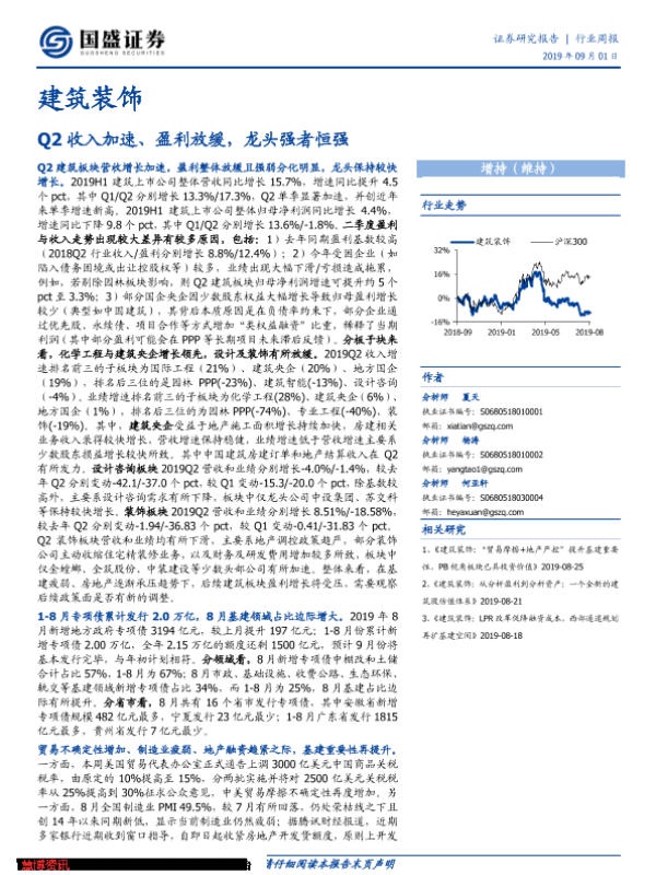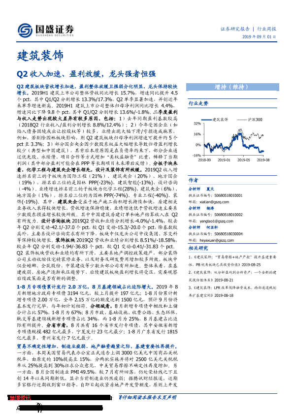 【国盛证券】【20190901】建筑装饰行业周报:Q2收入加速、盈利放缓,龙头强者恒强-14页