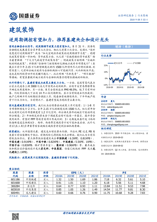 【国盛证券】【20190903】建筑装饰:逆周期调控有望加力,推荐基建央企和设计龙头-8页
