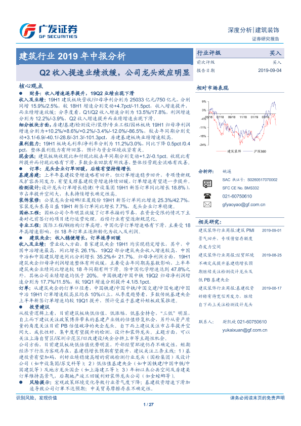【广发证券】【20190904】建筑行业2019年中报分析:Q2收入提速业绩放缓,公司龙头效应明显-27页