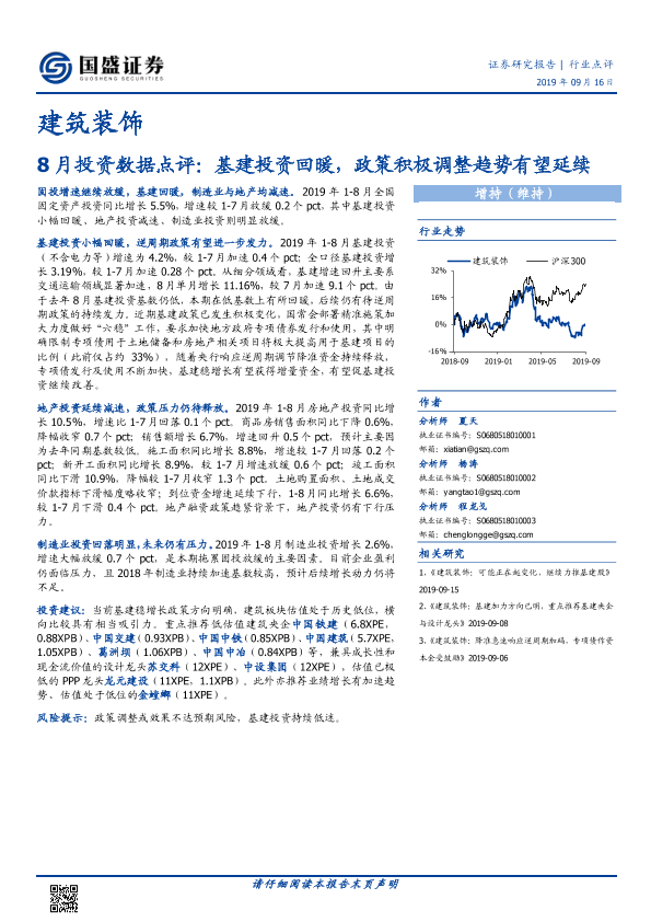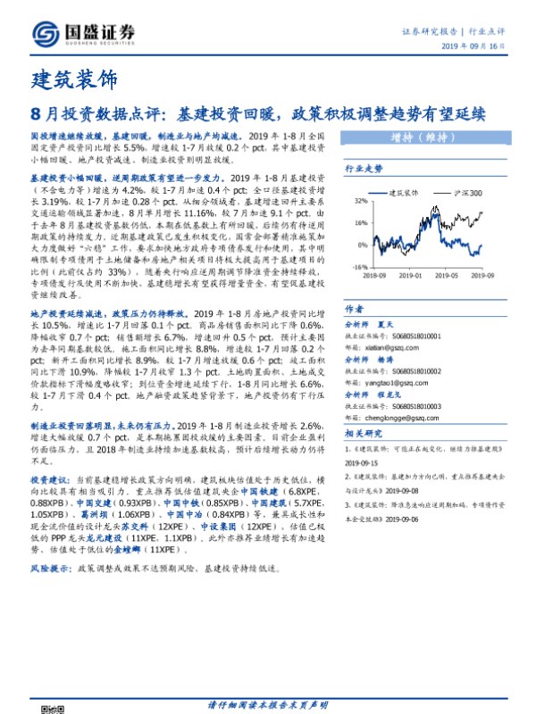 【国盛证券】【20190916】建筑装饰行业8月投资数据点评:基建投资回暖,政策积极调整趋势有望延续-5页