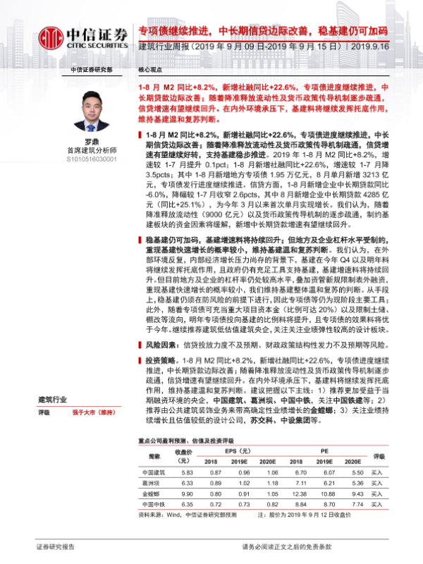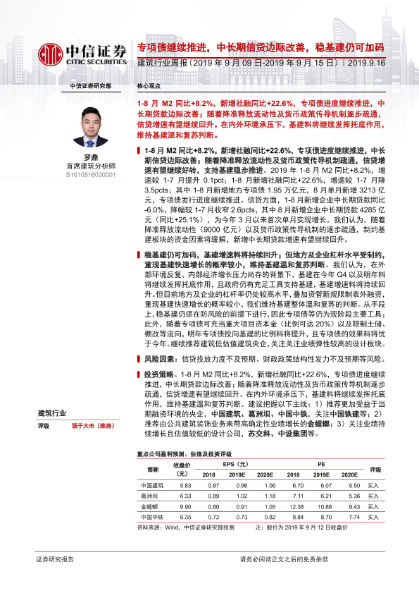 【中信证券】【20190916】建筑行业周报:专项债继续推进,中长期信贷边际改善,稳基建仍可加码-32页