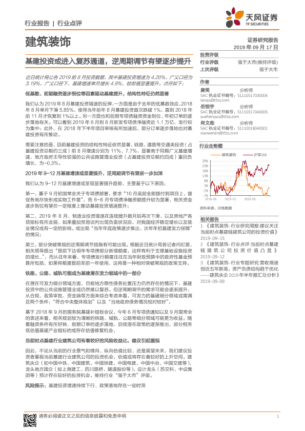 【天风证券】【20190917】建筑装饰行业点评:基建投资或进入复苏通道,逆周期调节有望逐步提升-3页