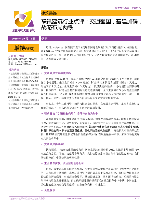 【粤开证券】【20190919】联讯建筑行业点评:交通强国,基建加码,战略布局两铁-4页