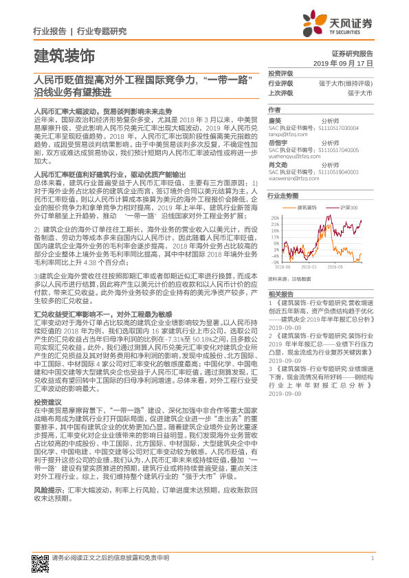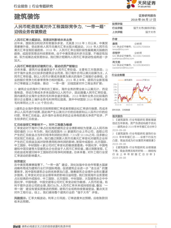 【天风证券】【20190917】人民币贬值提高对外工程国际竞争力,“一带一路”沿线业务有望推进-9页
