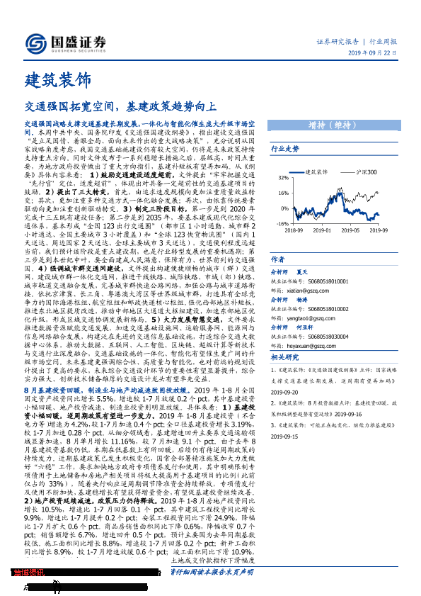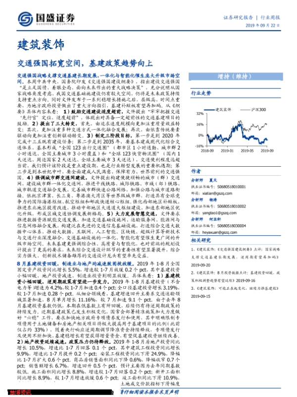 【国盛证券】【20190922】建筑装饰行业周报:交通强国拓宽空间,基建政策趋势向上-17页