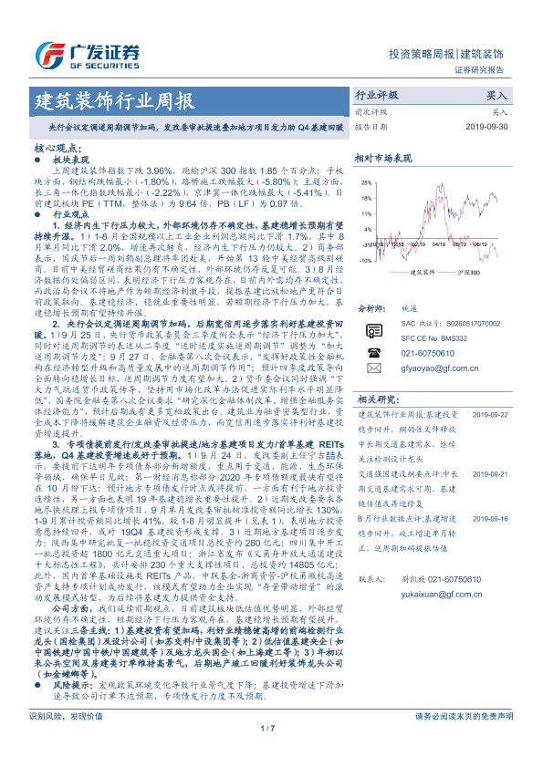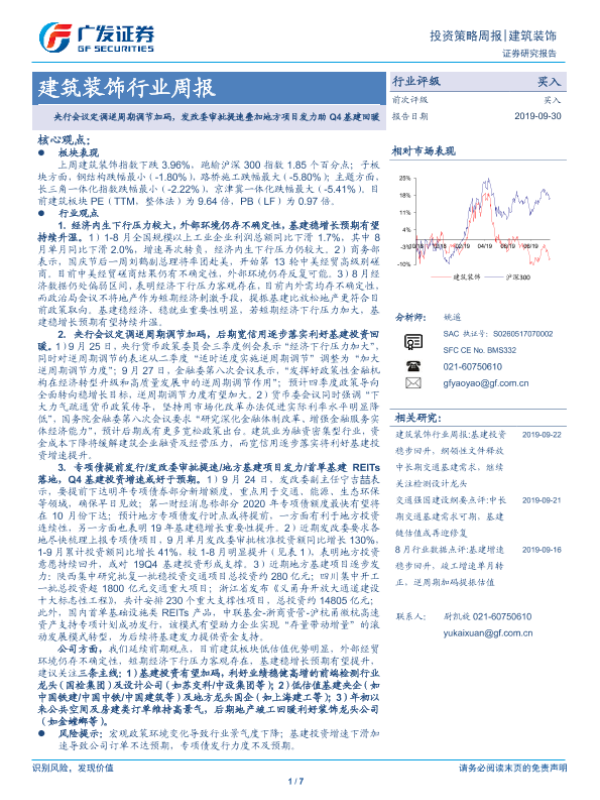 【广发证券】【20190930】建筑装饰行业周报:央行会议定调逆周期调节加码,发改委审批提速叠加地方项目发力助Q4基建回暖-7页