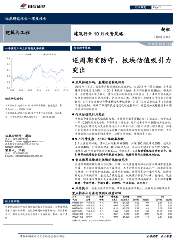 【国信证券】【20191011】建筑行业10月投资策略:逆周期重防守,板块估值吸引力突出-23页