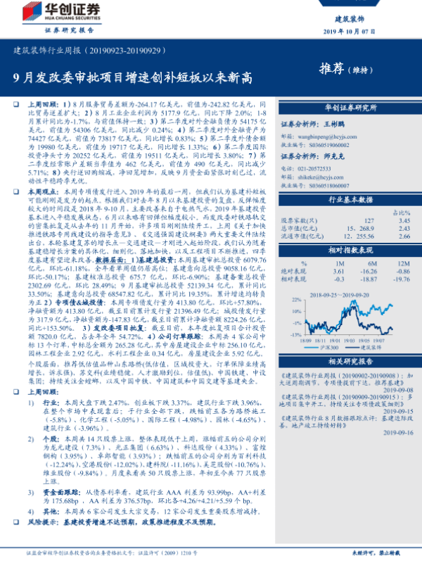 【华创证券】【20191007】建筑装饰行业周报:9月发改委审批项目增速创补短板以来新高-18页
