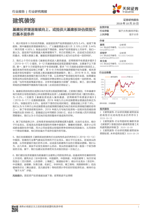 【天风证券】【20191020】建筑装饰行业研究周报:基建投资增速继续向上,或提供大基建板块估值提升的基本面条件-2页