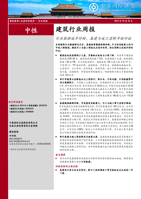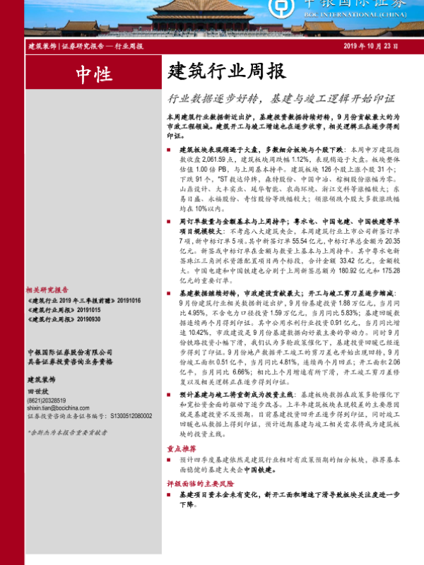 【中银证券】【20191023】建筑行业周报:行业数据逐步好转,基建与竣工逻辑开始印证-14页