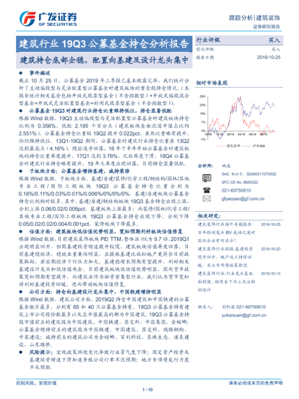 【广发证券】【20191025】建筑行业19Q3公募基金持仓分析报告:建筑持仓底部企稳,配置向基建及设计龙头集中-10页