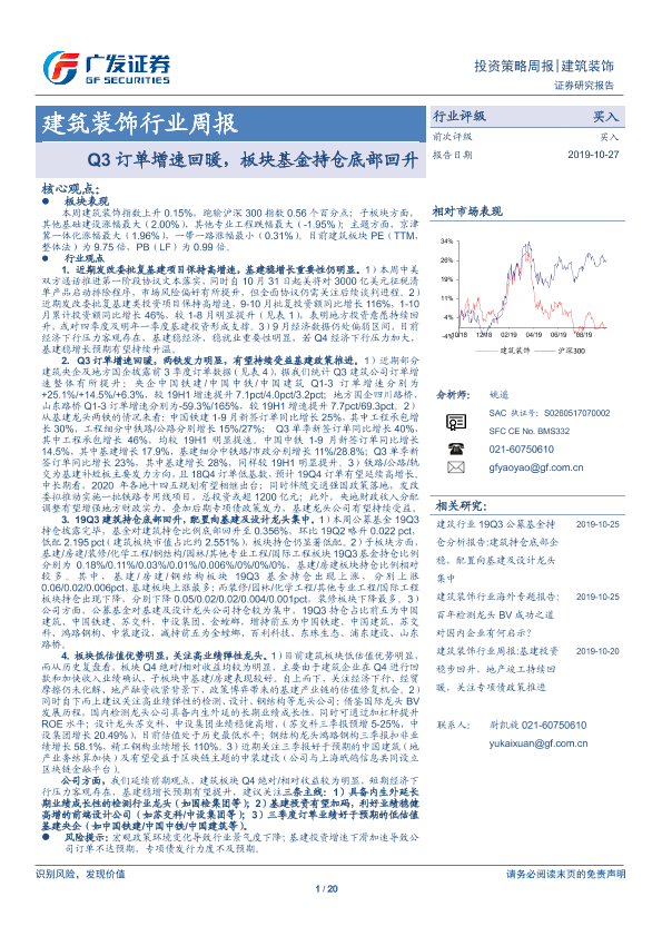 【广发证券】【20191027】建筑装饰行业周报:Q3订单增速回暖,板块基金持仓底部回升-20页