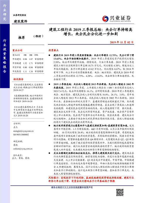 【兴业证券】【20191102】建筑工程行业2019三季报总结:央企订单持续高增长,央企民企分化进一步加剧-33页