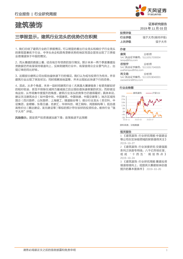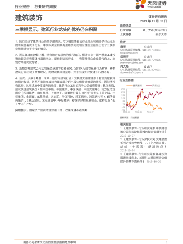 【天风证券】【20191103】建筑装饰行业研究周报:三季报显示,建筑行业龙头的优势仍在积聚-2页