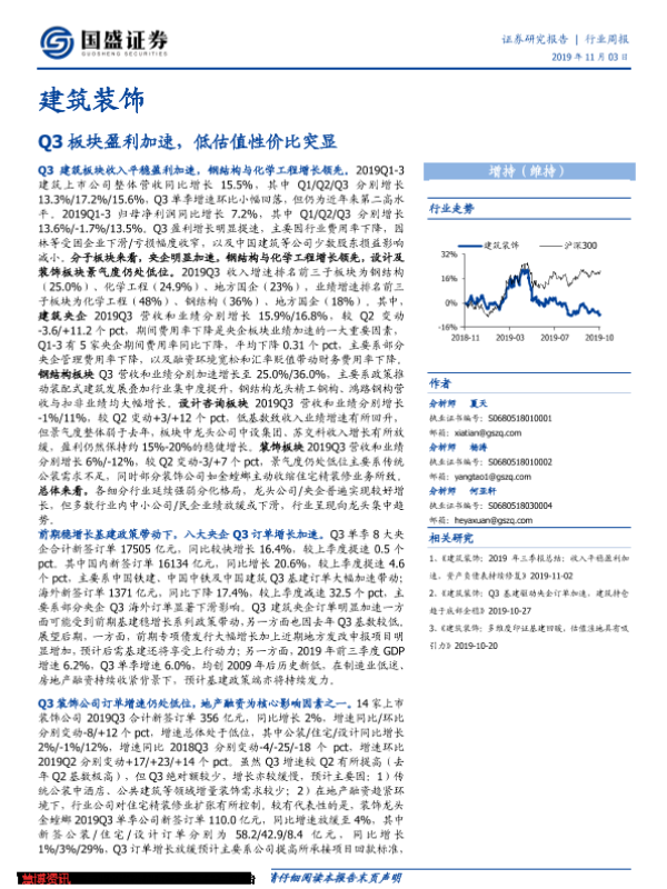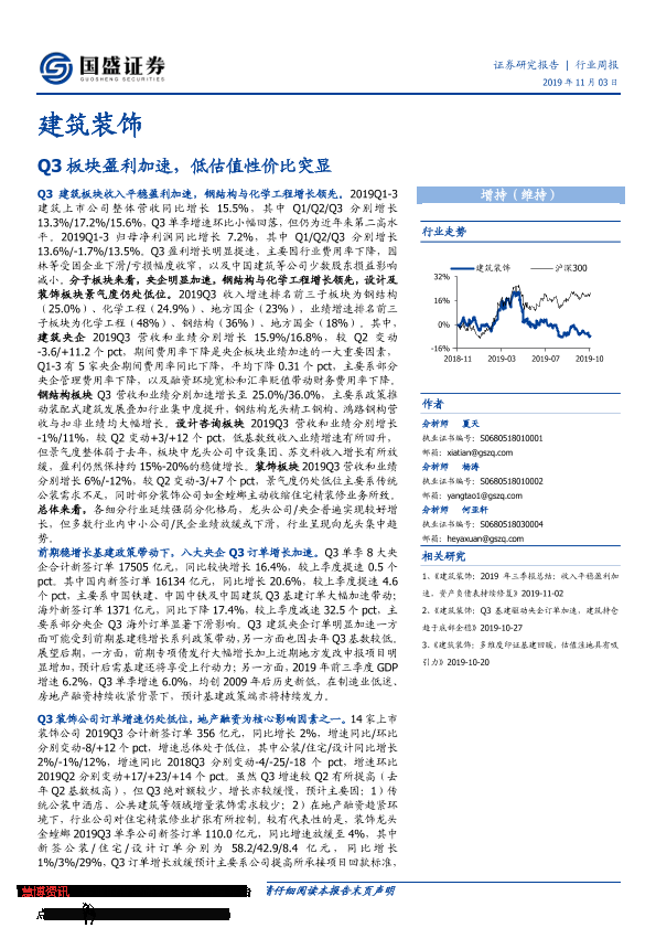 【国盛证券】【20191103】建筑装饰行业周报:Q3板块盈利加速,低估值性价比突显-16页