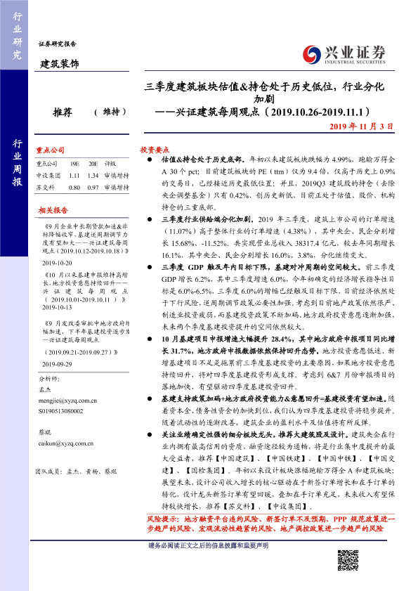 【兴业证券】【20191103】三季度建筑板块估值&持仓处于历史低位,行业分化加剧-28页