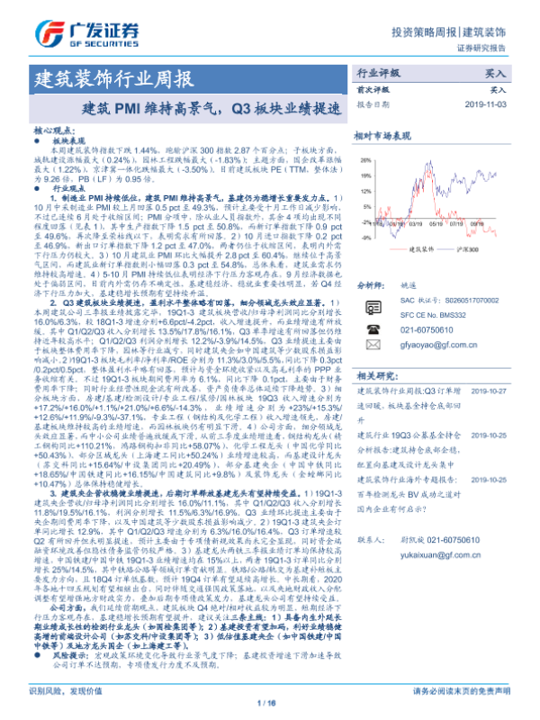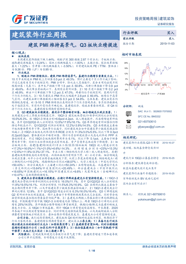【广发证券】【20191103】建筑装饰行业周报:建筑PMI维持高景气,Q3板块业绩提速-16页