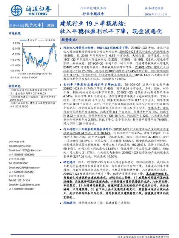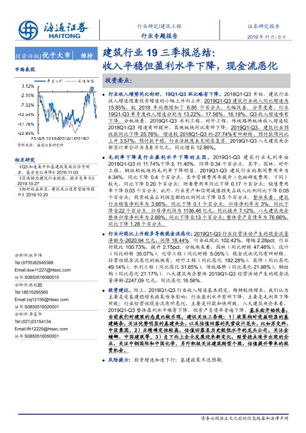 【海通证券】【20191110】建筑行业19三季报总结:收入平稳但盈利水平下降,现金流恶化-23页