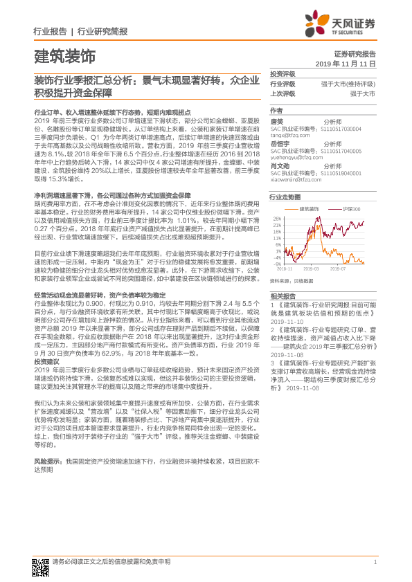 【天风证券】【20191111】装饰行业季报汇总分析:景气未现显著好转,众企业积极提升资金保障-10页