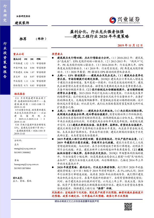 【兴业证券】【20191112】建筑工程行业2020年年度策略:盈利分化,行业龙头强者恒强-36页