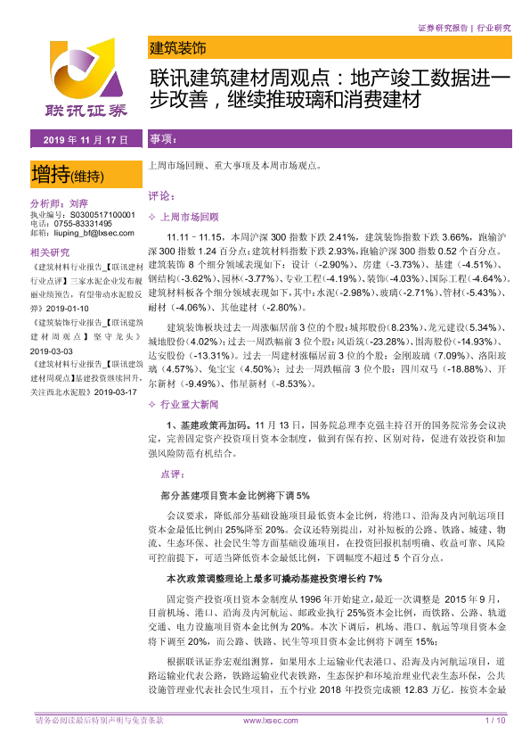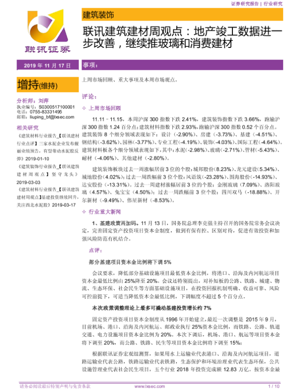 【粤开证券】【20191117】联讯建筑建材周观点:地产竣工数据进一步改善,继续推玻璃和消费建材-10页