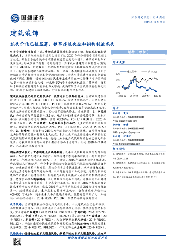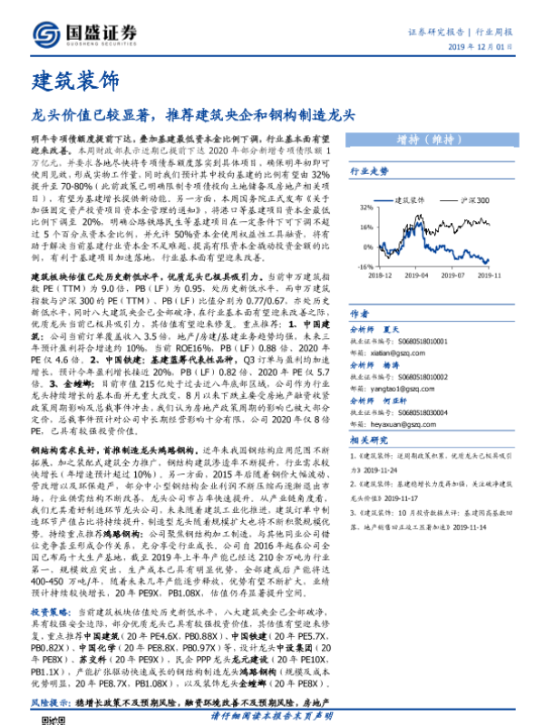 【国盛证券】【20191201】建筑装饰行业周报:龙头价值已较显著,推荐建筑央企和钢构制造龙头-15页