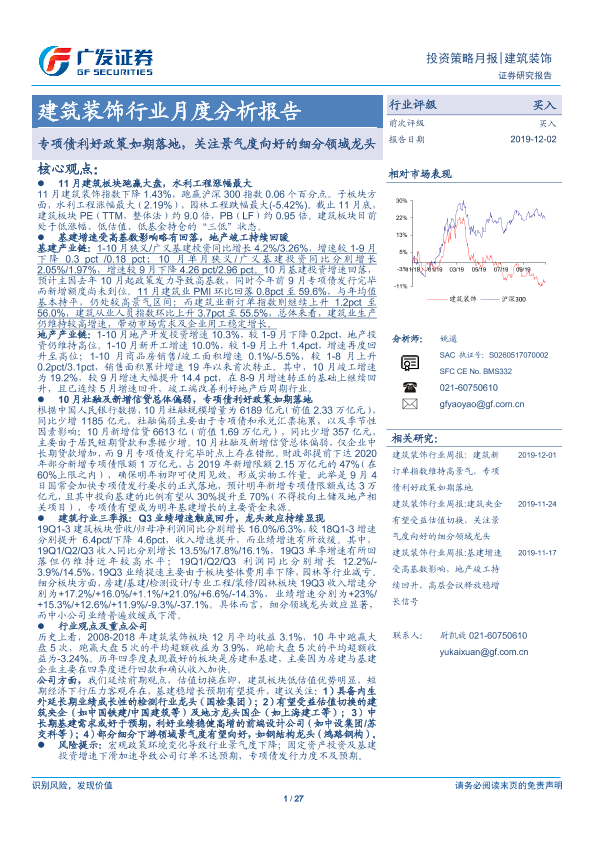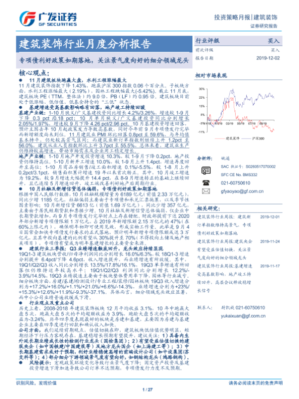 【广发证券】【20191202】建筑装饰行业月度分析报告:专项债利好政策如期落地,关注景气度向好的细分领域龙头-27页