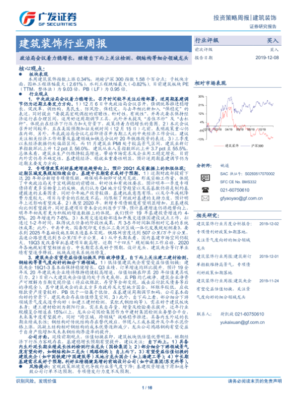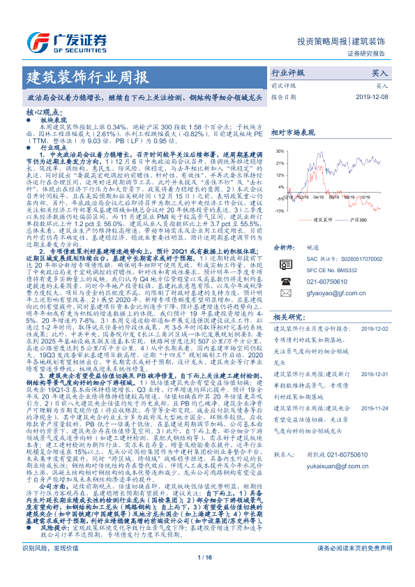 【广发证券】【20191208】建筑装饰行业周报:政治局会议着力稳增长,继续自下而上关注检测、钢结构等细分领域龙头-16页