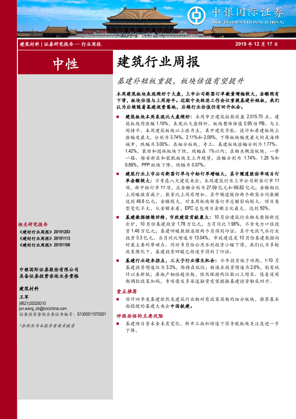 【中银证券】【20191217】建筑行业周报:基建补短板重提,板块估值有望提升-14页