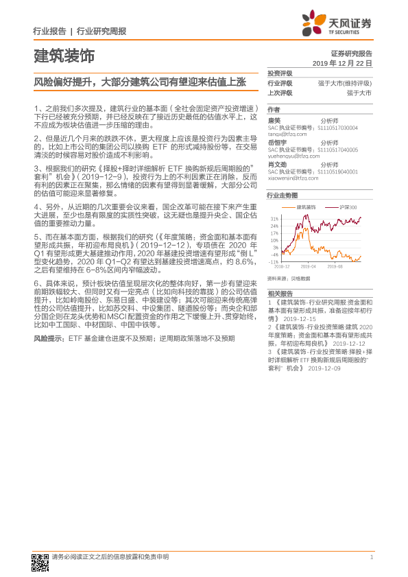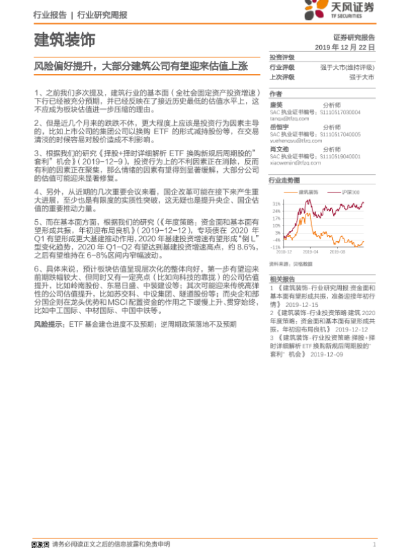 【天风证券】【20191222】建筑装饰行业研究周报:风险偏好提升,大部分建筑公司有望迎来估值上涨-2页