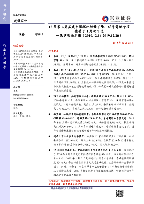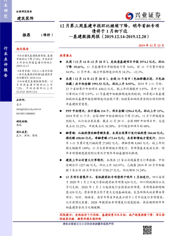 【兴业证券】【20191222】12月第三周基建申报环比继续下降,明年首批专项债将于1月初下达-19页