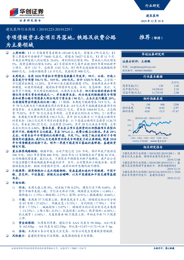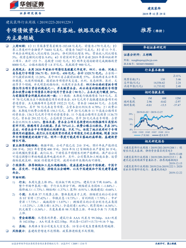 【华创证券】【20191229】建筑装饰行业周报:专项债做资本金项目再落地,铁路及收费公路为主要领域-19页
