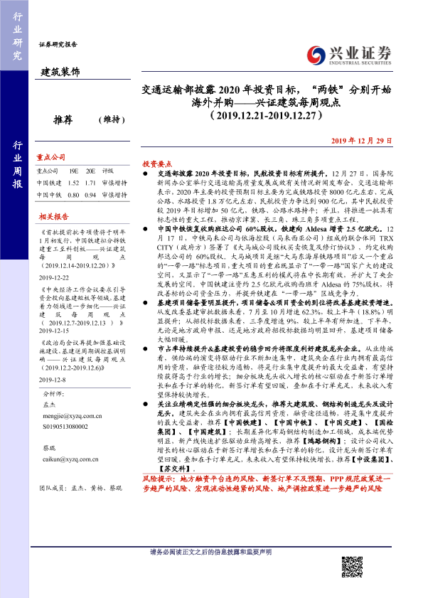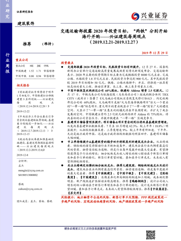 【兴业证券】【20191229】交通运输部披露2020年投资目标,“两铁”分别开始海外并购-25页