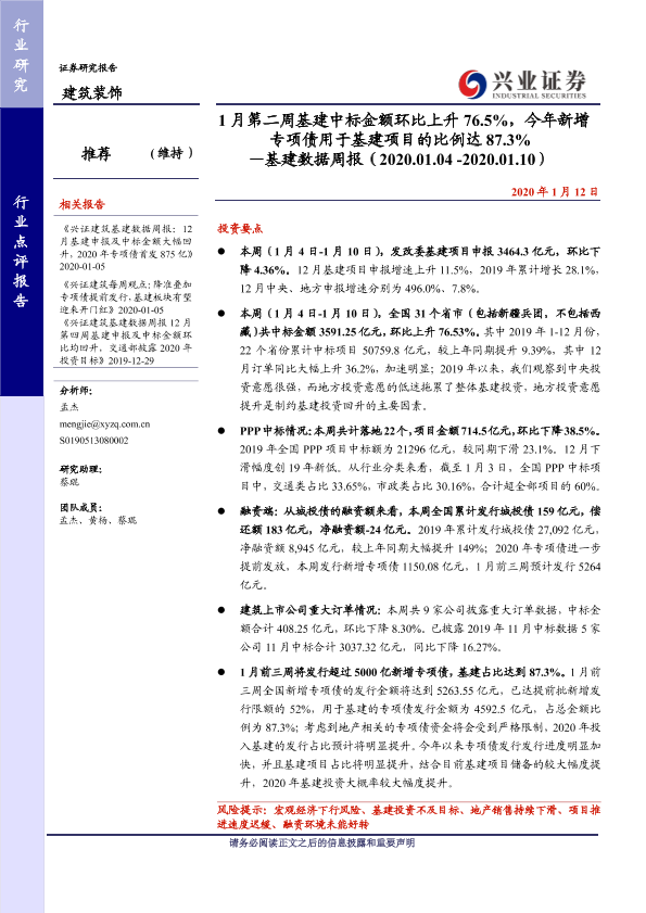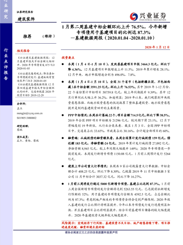 【兴业证券】【20200112】1月第二周基建中标金额环比上升76.5%,今年新增专项债用于基建项目的比例达87.3%-20页