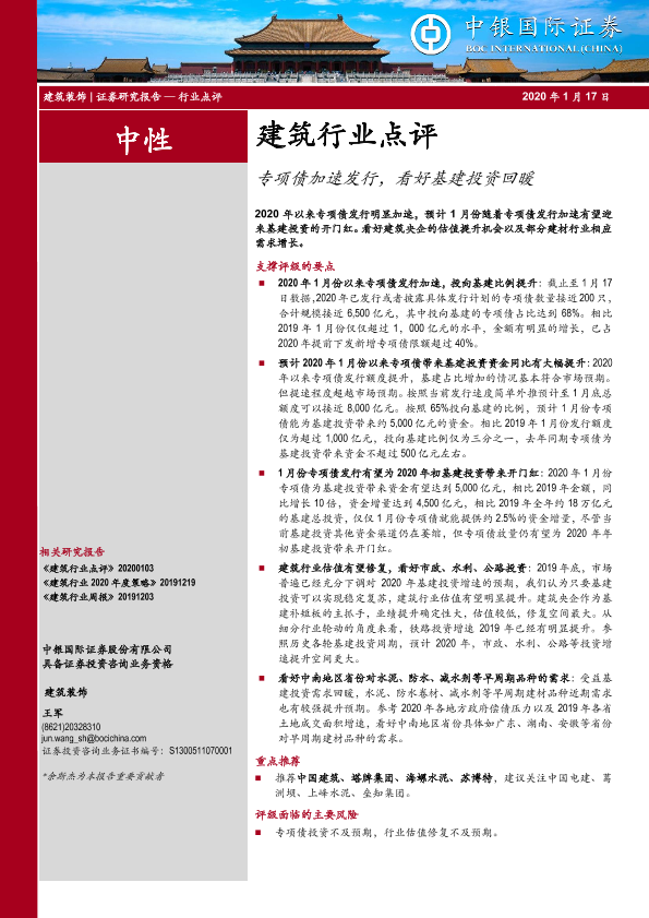 【中银证券】【20200117】建筑行业点评:专项债加速发行,看好基建投资回暖-4页