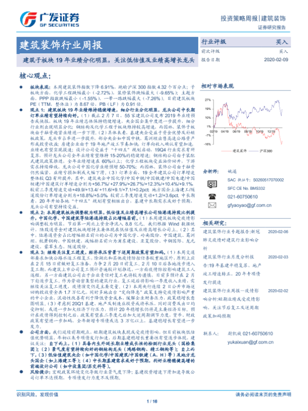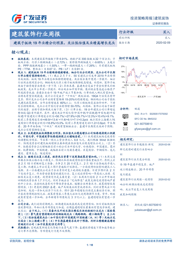 【广发证券】【20200209】建筑子板块19年业绩分化明显,关注低估值及业绩高增长龙头-16页