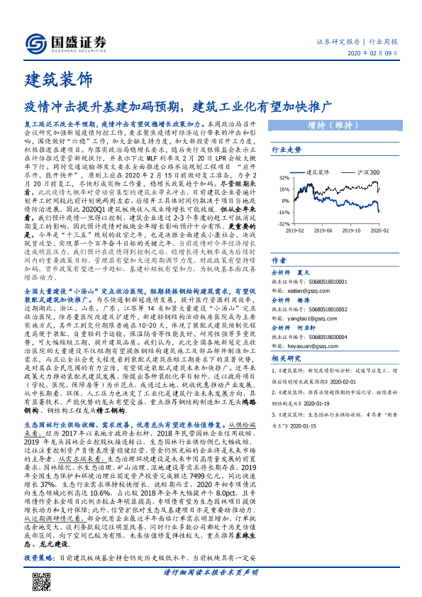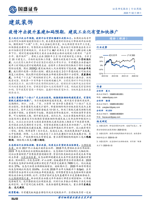 【国盛证券】【20200209】建筑装饰行业周报:疫情冲击提升基建加码预期,建筑工业化有望加快推广-14页