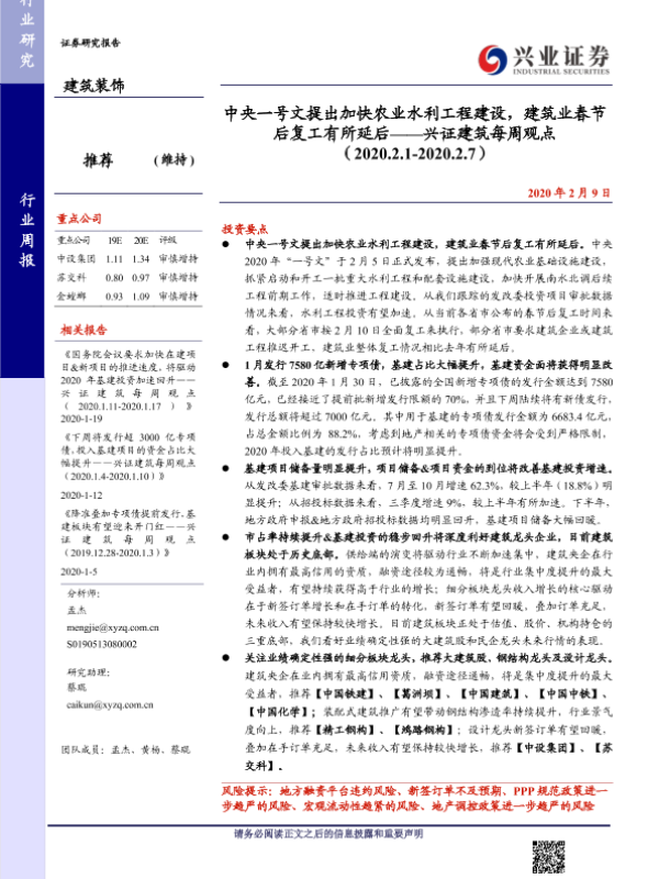 【兴业证券】【20200209】中央一号文提出加快农业水利工程建设,建筑业春节后复工有所延后——兴证建筑每周观点-28页