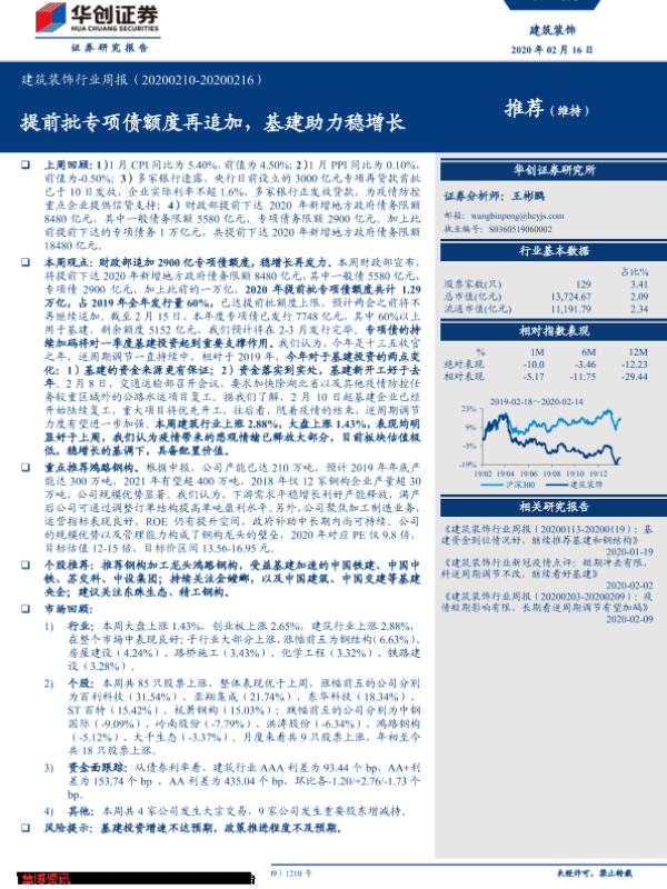 【华创证券】【20200216】建筑装饰行业周报:提前批专项债额度再追加,基建助力稳增长-15页
