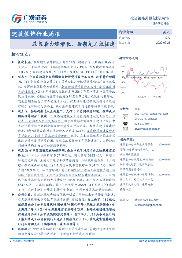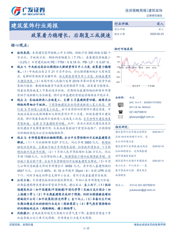 【广发证券】【20200223】建筑装饰行业周报:政策着力稳增长,后期复工或提速-17页
