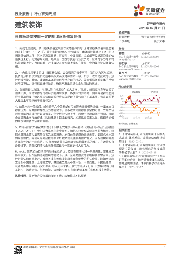 【天风证券】【20200223】建筑装饰行业研究周报:建筑板块或按照一定的规律逐渐修复估值-2页