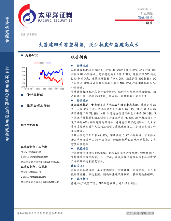 【太平洋证券】【20200301】建筑行业周报:大基建回升有望持续,关注抗震新基建高成长-26页