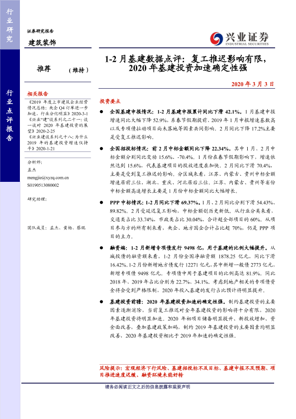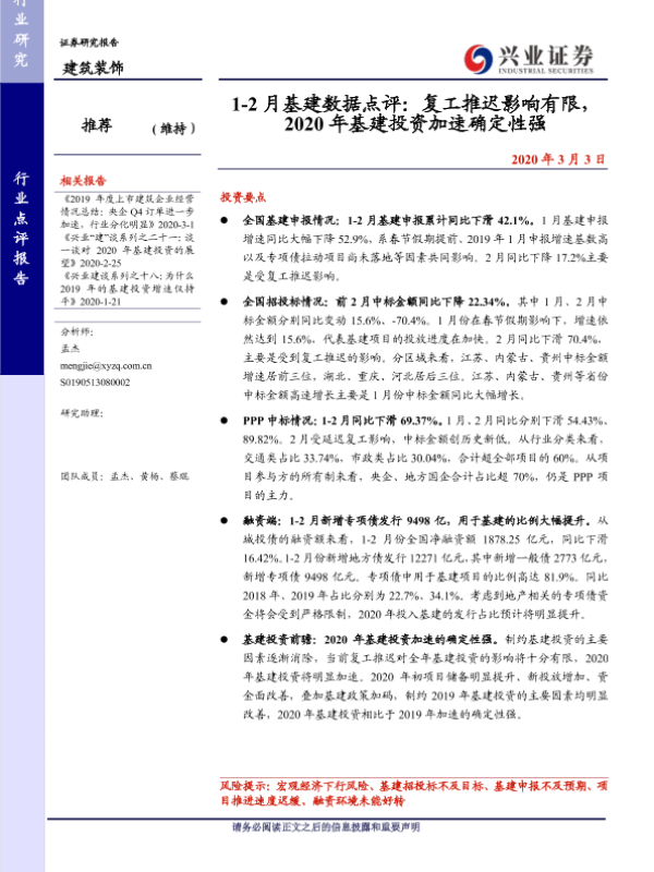 PPP项目 专项债发行 基建投资 复工影响 招投标情况