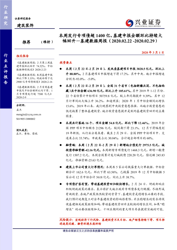 【兴业证券】【20200301】本周发行专项债超1400亿,基建申报金额环比持续大幅回升-20页