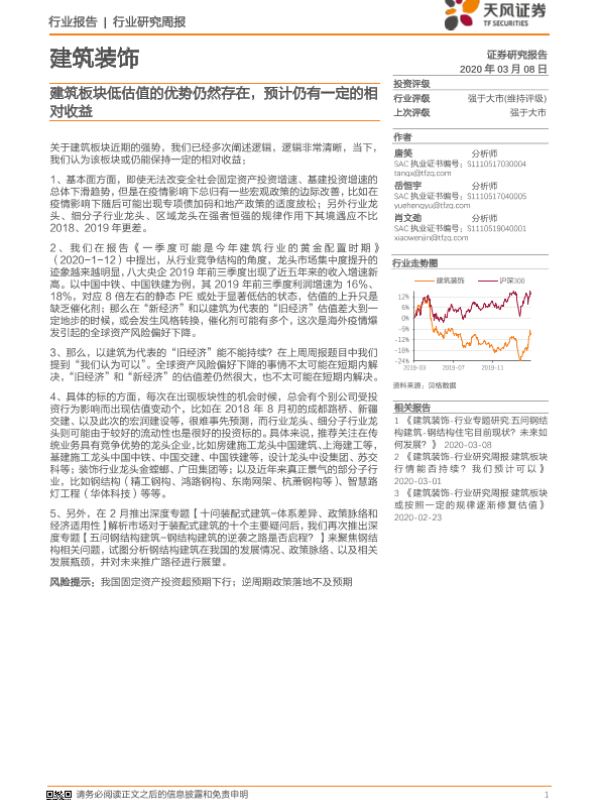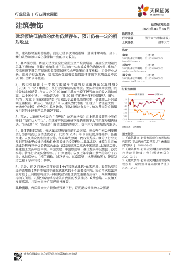 【天风证券】【20200308】建筑装饰行业研究周报:建筑板块低估值的优势仍然存在,预计仍有一定的相对收益-2页
