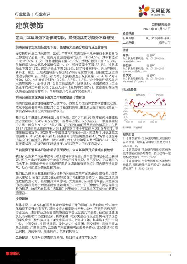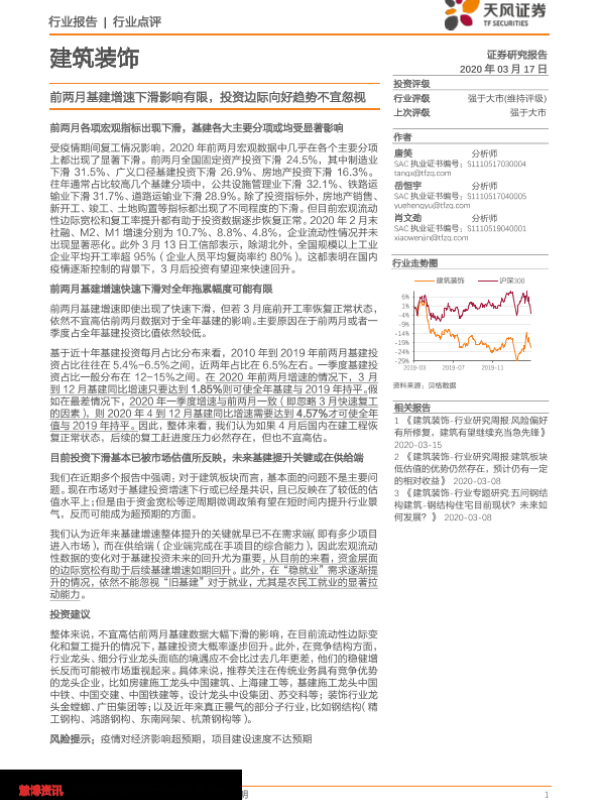 【天风证券】【20200317】建筑装饰行业点评:前两月基建增速下滑影响有限,投资边际向好趋势不宜忽视-2页
