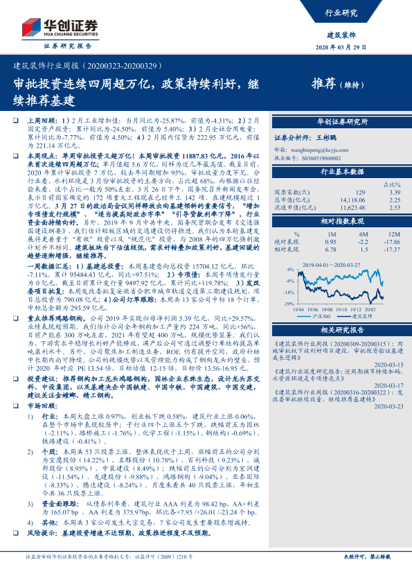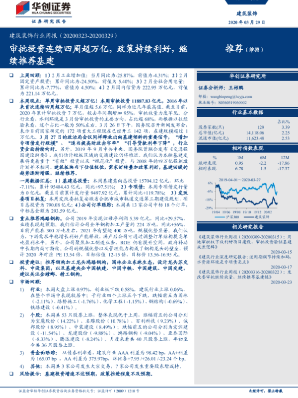 【华创证券】【20200329】建筑装饰行业周报:审批投资连续四周超万亿,政策持续利好,继续推荐基建-18页