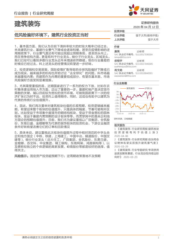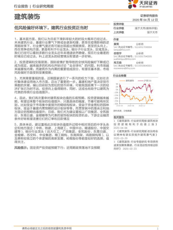 【天风证券】【20200412】建筑装饰行业研究周报:低风险偏好环境下,建筑行业投资正当时-2页