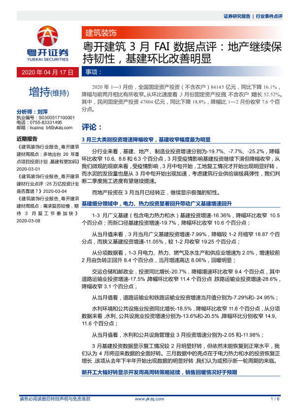 【粤开证券】【20200417】粤开建筑3月FAI数据点评:地产继续保持韧性,基建环比改善明显-6页