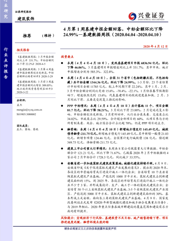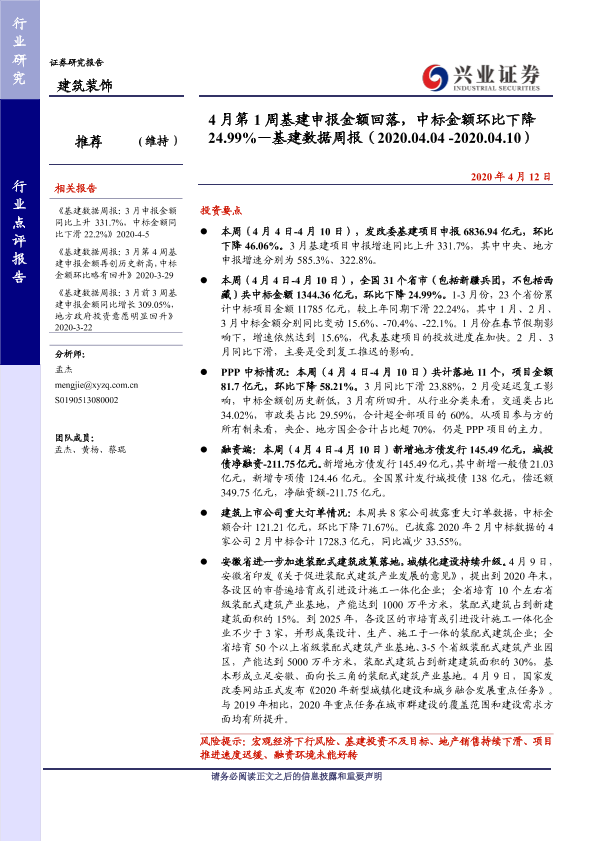 【兴业证券】【20200412】4月第1周基建申报金额回落,中标金额环比下降24.99%-24页